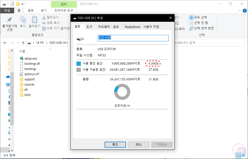 설치가 완료되면 USB에 약 4GB 이상의 설치 파일이 담긴 것을 확인할 수 있고, 이제 이 USB를 가지고 윈도우10 클린 설치를 진행하기만 하면 됩니다.