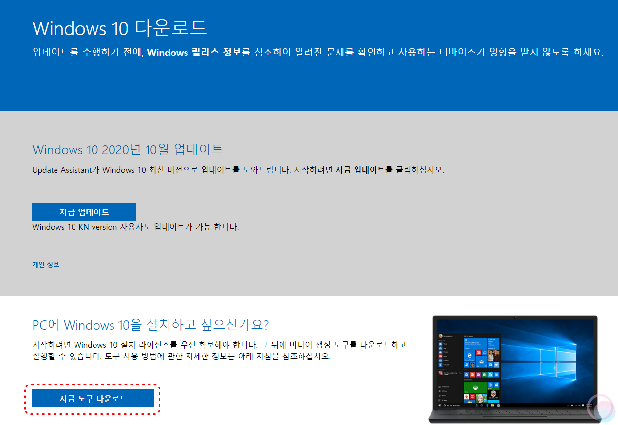 마이크로스프트 공식 홈페이지(바로가기)로 이동한 후 하단에서 지금 도구 다운로드 버튼을 눌러서 설치 파일을 다운로드받아줍니다.
