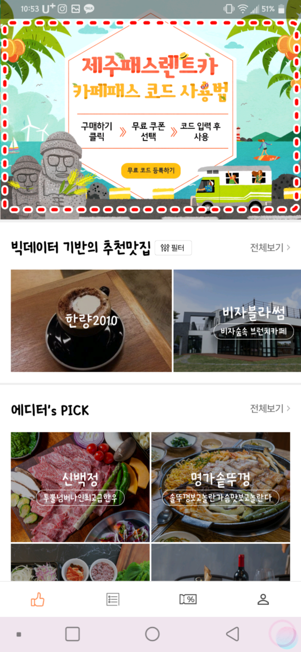 렌트카와 함께 카페패스 예약을 완료했다면 카카오톡으로 카페패스 무료코드 8자리가 발송될텐데요. 이제 이 코드를 사용하기 위해 앱스토어에서 제주패스맛집을 설치한 후 상단 배너 제주패스렌트카 카페패스 코드 사용법을 눌러주세요. 배너가 빠르게 움직이기 때문에 저도 찾는데 한참이 걸렸답니다.