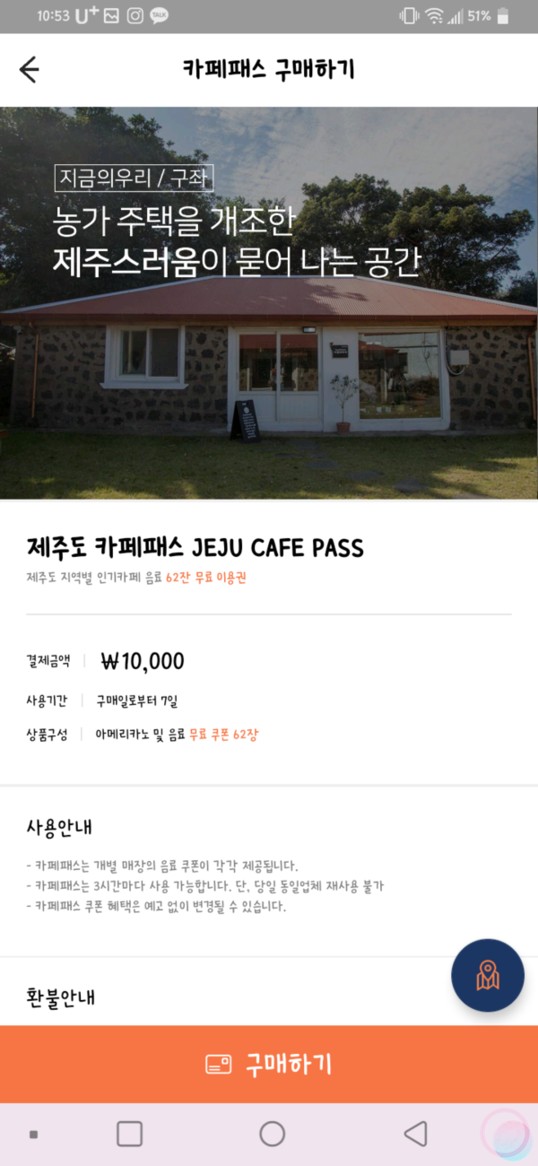제주도에서 사용할 렌트카를 예약하다가 제주도 카페패스라는 것이 보여서 예약을 해봤습니다. 여행하면서 카페를 찾아다니는 편이 아니지만 그래도 제주도에 있는 약 150개의 카페에서 3시간 간격마다 아메리카노 한 잔을 무료로 받을 수 있다고 하니, 1~2곳만 이용해도 손해는 아니겠죠?