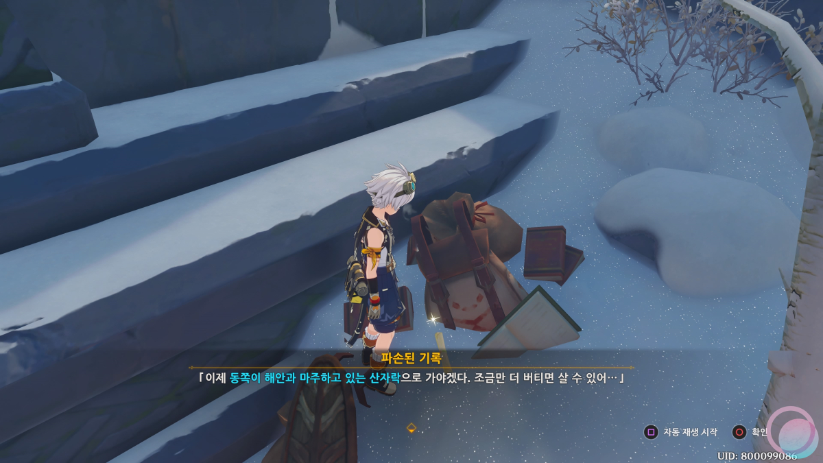 주위를 날아다니다보면 물길이 안쪽으로 이어져 있는데, 물길을 따라서 동굴 안으로 들어가면 빛이 나는 곳이 있을 것입니다. 그 곳을 살펴보면 세 번째 파손된 기록과 함께 보물 상자를 획득할 수 있습니다.