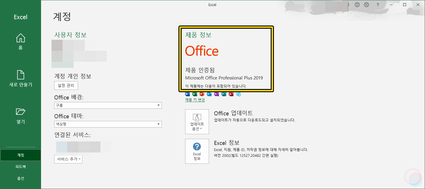 정품인증이 제대로 진행되었는지 확인해보겠습니다. 엑셀을 실행한 후 상단의 자신의 계정을 선택하고 Office 사용자 정보를 누르시면 Microsoft Office Professional Plus 오피스 2019 정품인증이 정상적으로 적용된 것을 확인할 수 있습니다.(제가 설치한 버전은 2002 버전으로 빌드 12527.20482 간편 실행 버전이네요.)
