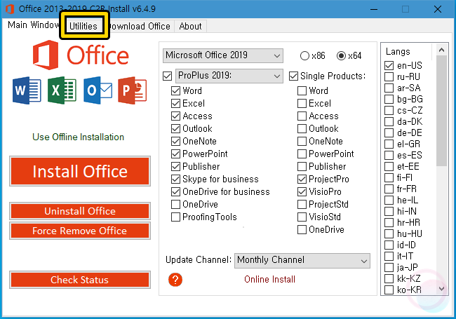 2-2) 프로그램이 실행되면 상단의 Utilities로 들어간 후 Office RETAIL=VLL를 눌러줍니다.(만약 아래의 과정으로 실행이 되지 않는다면 왼쪽에 있는 Online KMS를 체크한 후 진행하시면 됩니다.)