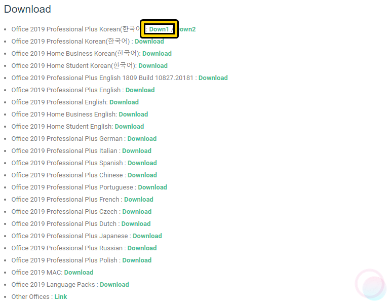 1-1) 먼저 FreewareGaZ 다운로드 사이트(바로가기)에서 트라이얼 버전을 먼저 다운받아야 합니다. 링크로 들어가신 후 하단으로 쭉 내려가면 다운로드 목록이 나오는데 Office 2019 Professional Plus Korean(한국어) 오피스2019를 다운받아주시면 됩니다.