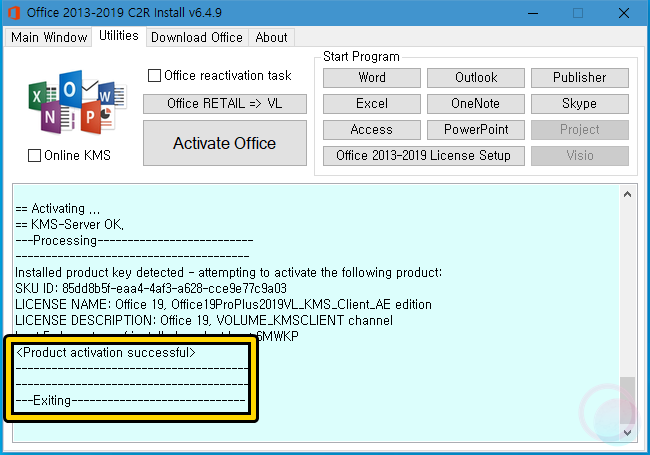 그러면 다시 아래의 로그창이 활발하게 움직일텐데, 한 10초 정도 기다리시면 하단에 Product activation successful이라는 메시지가 출력될 것입니다. 이 과정까지 모두 완료되었다면 오피스2019 크랙 정품인증 완료입니다.