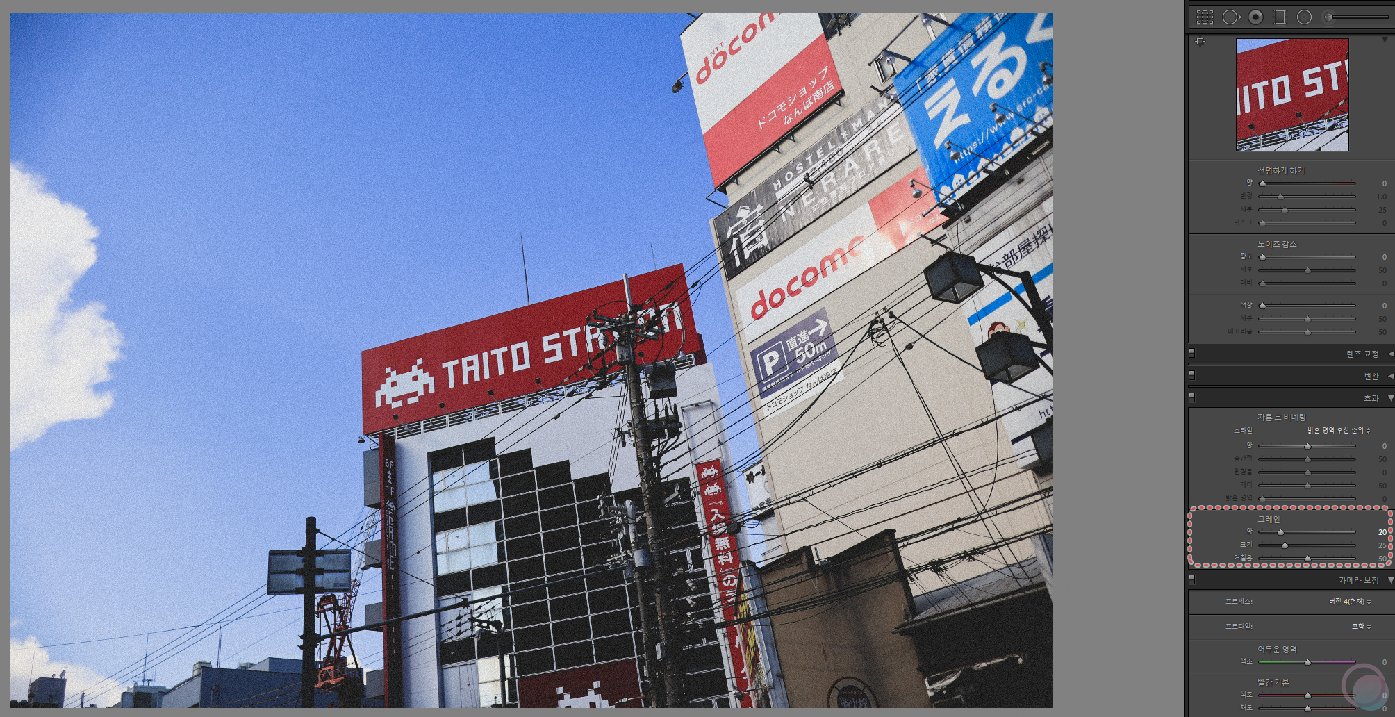 노이즈가 조금 과하다고 생각되거나 조금 더 추가하고 싶으신 분들은 현상메뉴쪽을 살펴보시면 하단에 그레인이라는 메뉴가 있습니다. 이곳에서 양, 크기, 거침 정도를 설정하시면 됩니다.