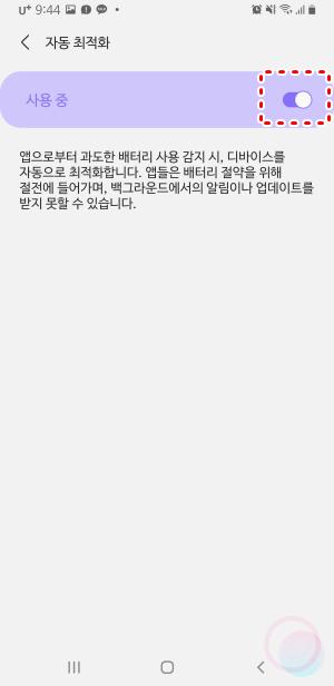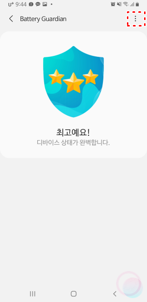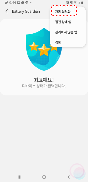 Battery Guardian(배터리 가디언)은 배터리 소모가 심한 앱을 찾아서 관리할 수 있는 기능입니다. 최적화가 잘 되고 있다면 사진처럼 '최고예요!'라는 문구가 뜨지만 배터리 소모가 심한 앱이 있을 경우에는 하단 메뉴에 앱이 표기됩니다. 설정에서 자동 최적화 기능을 켜고 끌 수 있으니 하나하나 관리가 귀찮으신 분들은 자동 최적화 기능을 활성화 하는 것을 추천드립니다.