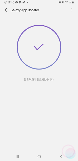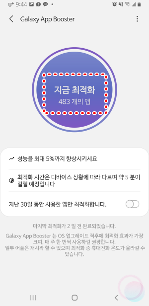 ※ App Booster 기능은 OS를 업그레이드 한 직후에 최적화 하는 것이 효과가 가장 크며 매 주 한번씩 사용하는 것을 권장합니다. 또한 최적화가 진행되는 도중 스마트폰의 발열이 심할 수 있으니 참고하시길 바랍니다.