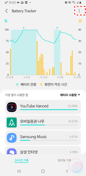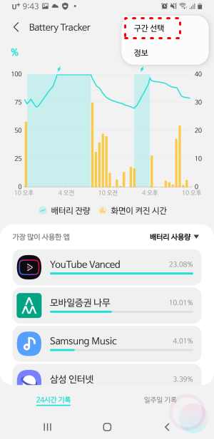 Battery Tracker(배터리 트래커)는 배터리 사용량을 보여주는 기능입니다. 24시간, 일주일 단위로 파악이 가능하며 구간 선택을 이용하여 자신이 어떤 앱을 얼만큼 사용했는지 확인할 수 있습니다. 다만 이 기능 역시 안드로이드에서 기본적으로 제공하는 기능이기 때문에 크게 유용하지는 않습니다.
