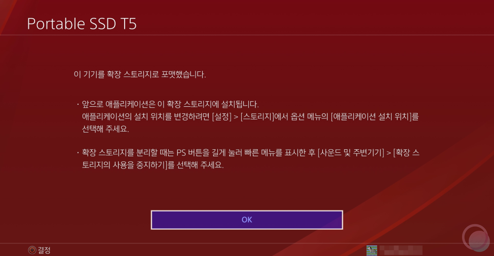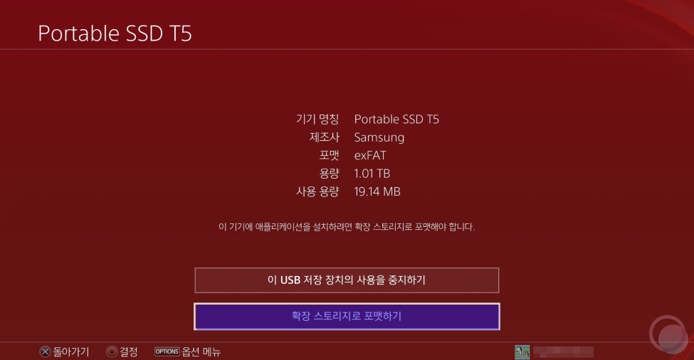 포맷 과정을 쭉쭉 진행하고 나면 외장 SSD를 PS4용으로 사용할 수 있다고 표시됩니다.