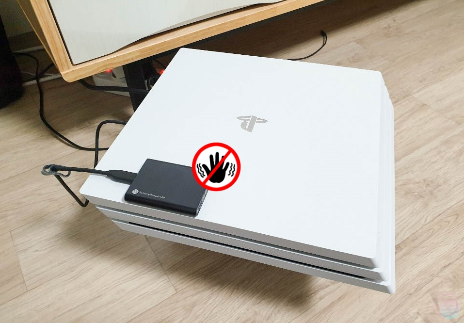 여기서 주의하셔야 할 부분은 SSD를 PS4 본체 위에 올려놓을 경우 PS4에서 발생한 발열이 그대로 외장 SSD T5에 전달될 수 있기 때문에 이렇게 사진처럼 본체 위에 올려놓고 사용하는것보다 바닥에 두거나 PS4에 붙여놓지 않는것을 추천드려요.