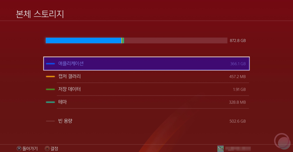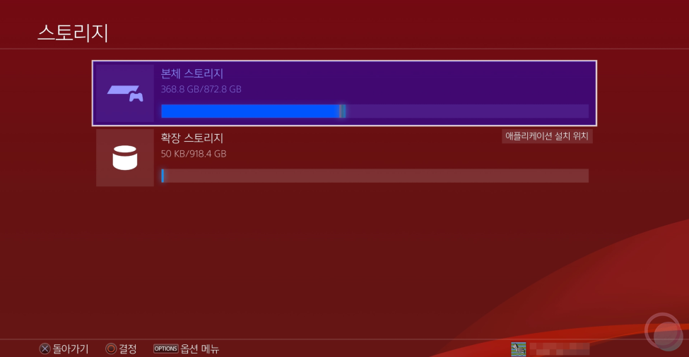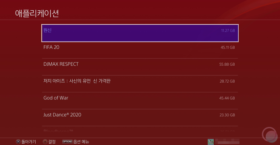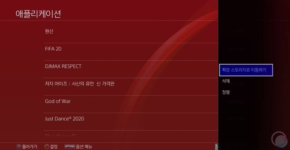 이제 기존 HDD에 설치되어 있던 게임들을 외장 SSD로 옮겨야 하는데요. 설정-스토리지-본체 스토리지-애플리케이션으로 들어가서 옮길 게임을 선택하기 위해 듀얼쇼크4의 OPTIONS 버튼을 눌러주세요.
