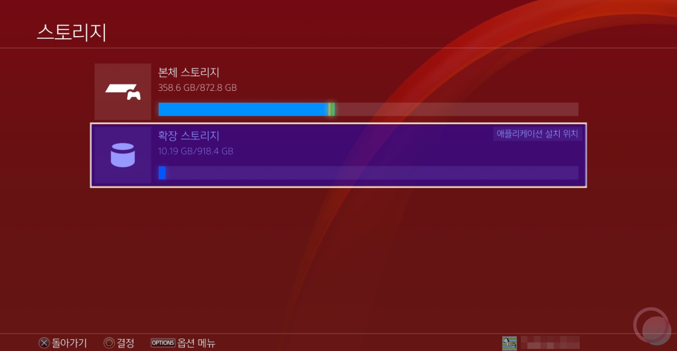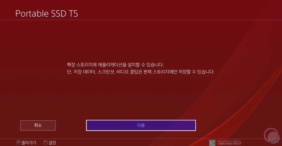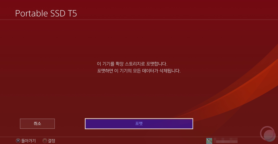 외장 SSD를 정상적으로 사용하기 위해서는 PS4 용도에 맞게 포맷을 진행해주어야 하니, 확장 스토리지로 포맷하기를 선택해주세요.