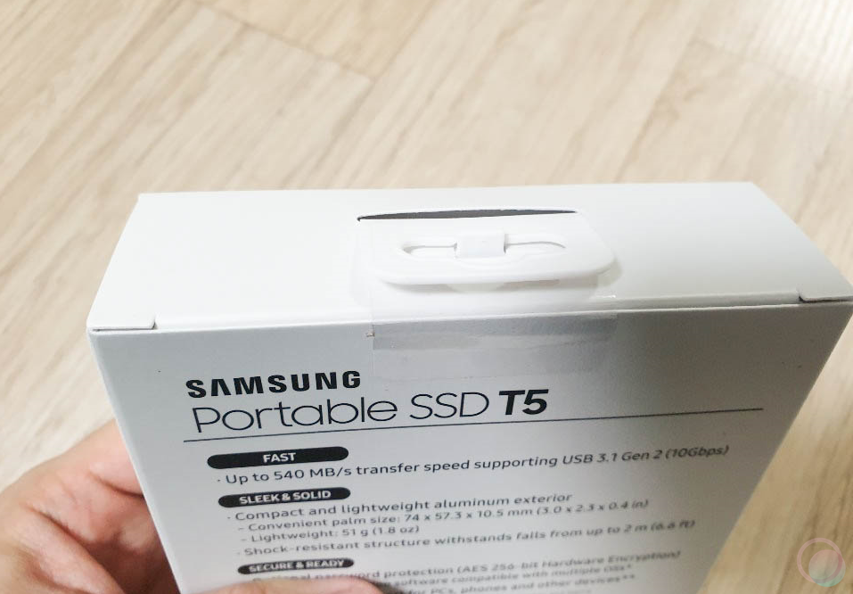T5를 개봉해보니 제가 생각했던것보다 크기가 훨씬 작았어요. 기존에 사용하던 SSD는 딱 손바닥만했는데, T5는 정말 컴팩트한 사이즈더라구요? 크기가 크면 어떻게 하지라는 고민을 했었는데 작은 크기만큼 무게도 51g밖에 하지 않아서 대만족!