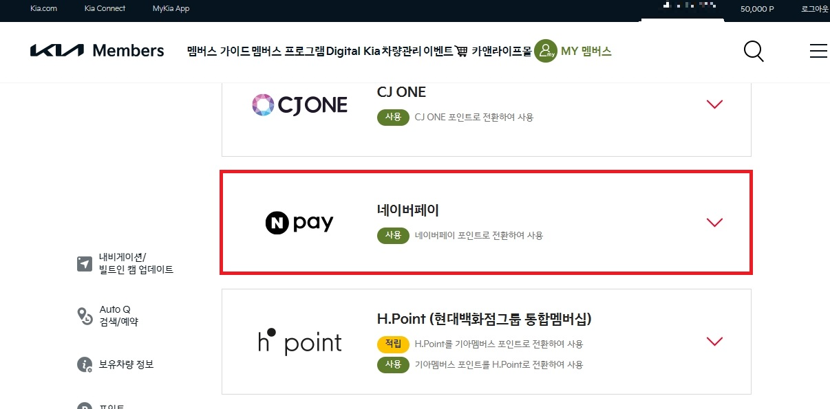 좌측의 포인트를 누르면 기아멤버스 포인트를 활용할 수 있는 여러 제휴 사이트들이 나오는데, 여기서 제일 하단에 위치한 네이버페이를 눌러주고 전환하기만 하면 된다.