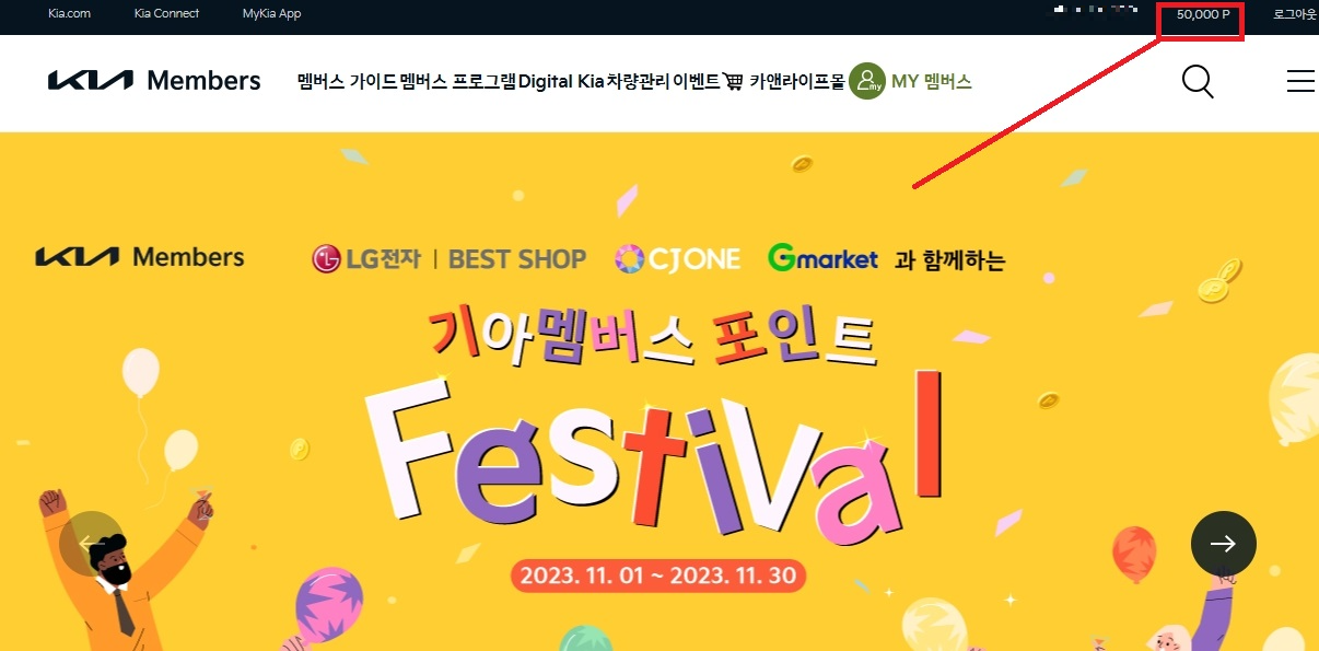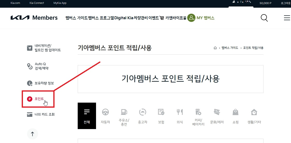 먼저 기아멤버십 사이트에 로그인하고 상단에서 적립된 포인트를 눌러준다.